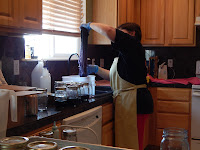 Missed the shot where this batch was in the acid dye and vinegar, but here they are in a kettle to steam set. She did several batches, so what I missed you still will get. |